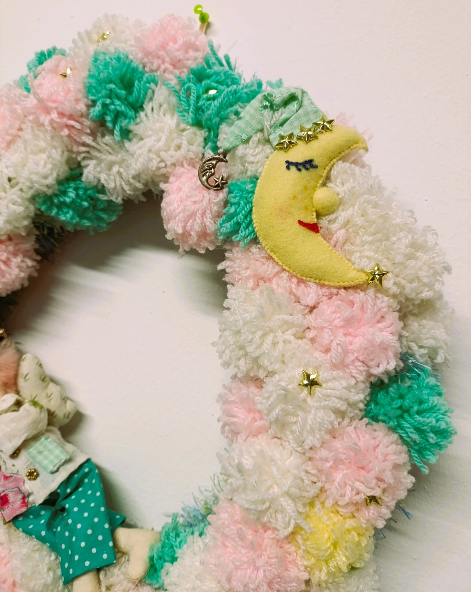 einen handgefertigten Kranz, der perfekt für ein Kinderzimmer geeignet ist. Er besteht aus bunten Pompons in Rosa, Grün und Weiß, die miteinander arrangiert sind. Der Kranz ist mit liebevollen Details verziert, darunter ein kleiner Stoff-Mond mit einem freundlichen Gesicht und ein Wichtel, der auf einem Kissen ruht. Kleine goldene Sternchen verleihen ihm einen zusätzlichen märchenhaften Touch.