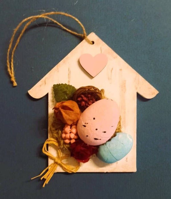 wunderbare Ostergeschenke oder Holzanhänger-Dekorationen. dekoriert mit natürlichen Trockenblumen, Jute und Korbgeflecht. Höhe 12 cm. Preis pro Stück.