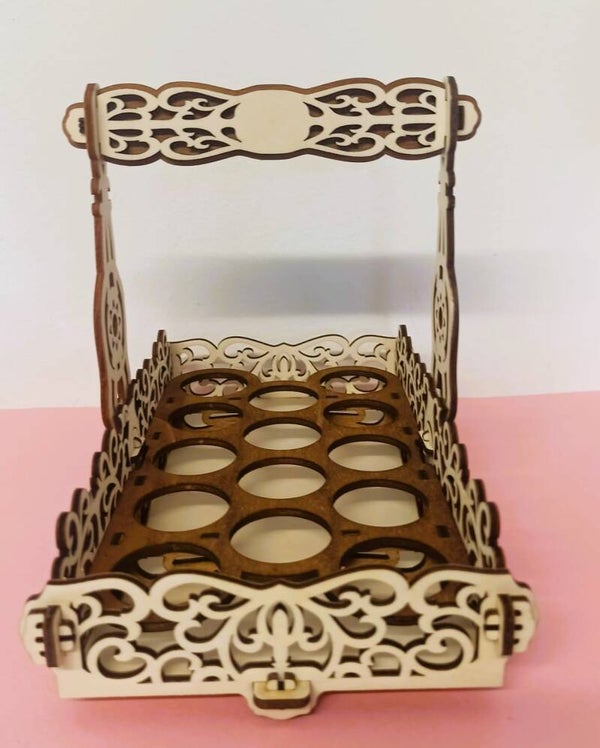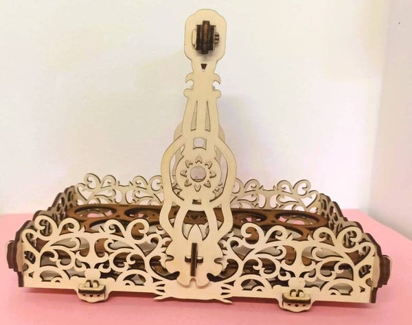 dekorativen, filigran gearbeiteten Halter aus Holz, der mit einem aufwendigen Muster verziert ist. Dieser Halter könnte als funktionales Dekorationsobjekt für den Haushalt oder für Veranstaltungen genutzt werden, bei denen stilvolle Präsentation im Vordergrund steht.