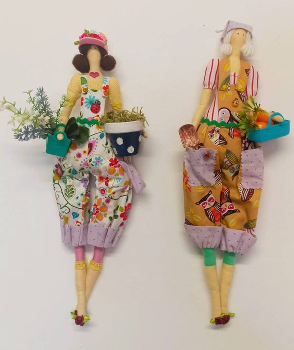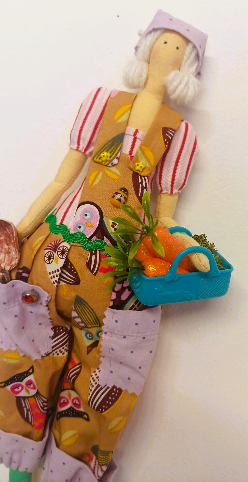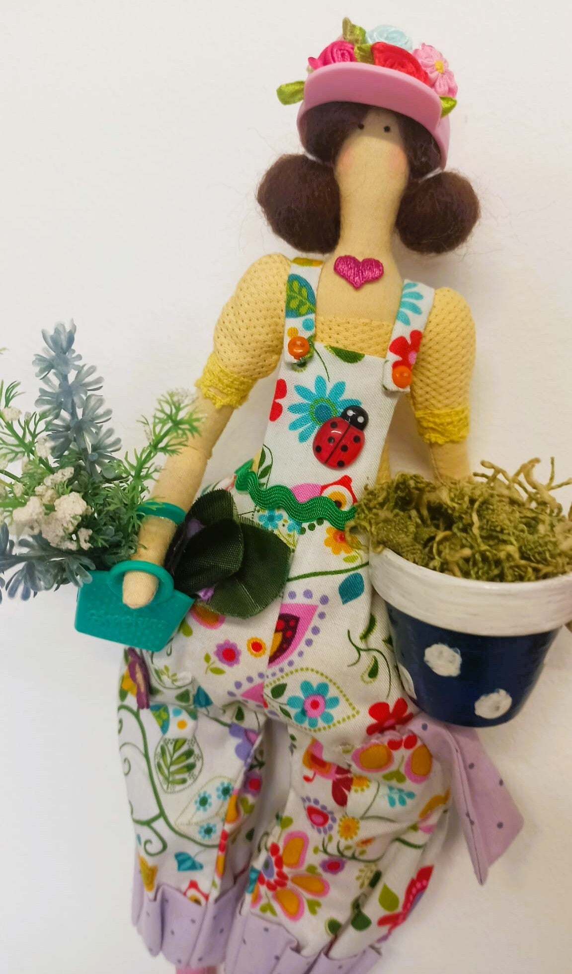 Diese bezaubernde, handgefertigte Stoffpuppe bringt Charme und Freude in Ihr Zuhause. Mit viel Liebe zum Detail gestaltet, trägt sie eine bunte, florale Latzhose, ein passendes Accessoire-Set und hält kleine Gartengeräte sowie Pflanzen in den Händen. Jede Puppe wird aus hochwertigen Materialien gefertigt und überzeugt durch ihre Einzigartigkeit.