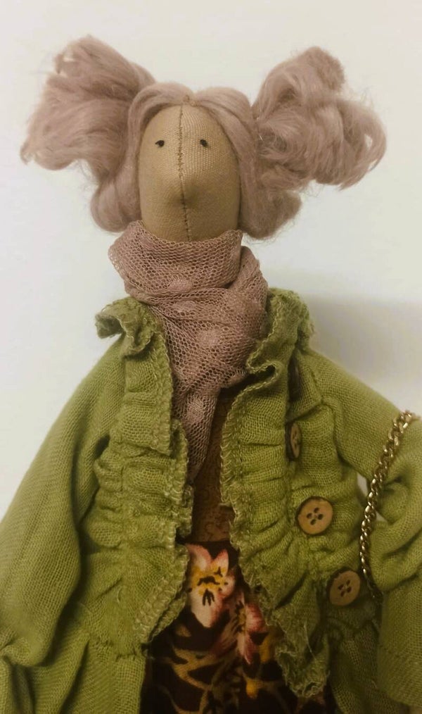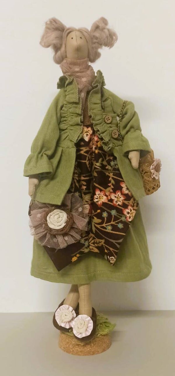 Innenpuppe Tilda Barabara Boho in Grün. steht auf einem Ständer. und in Ihrer Handtasche können Sie „kleine Schätze“ aufbewahren.Höhe 40 cm.