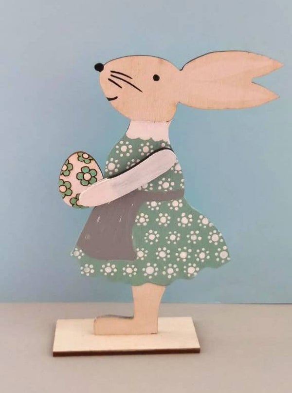 Bringen Sie Osterstimmung in Ihr Zuhause mit dieser liebevoll gestalteten Holzfigur! Der niedliche Hase ist detailreich bemalt und trägt ein grünes Kleid mit Blumenmuster. In seinen Armen hält er ein hübsch verziertes Osterei.