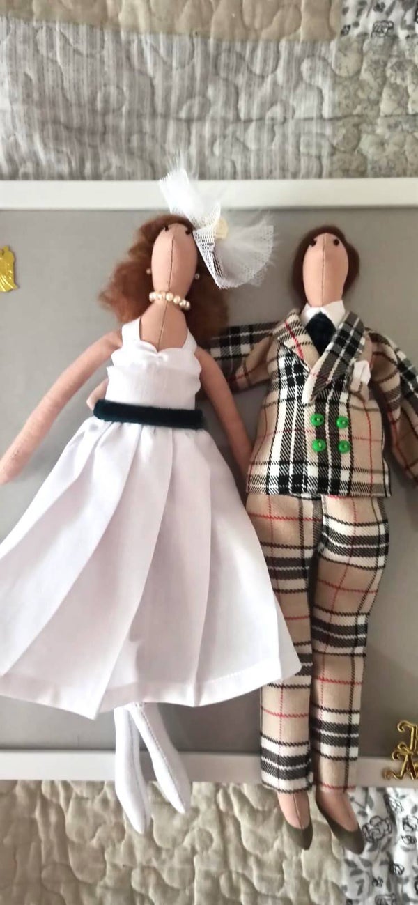 Wir machen Sie auf ein originelles Geschenk für Ihren Hochzeitstag, Ihre Hochzeit oder Ihr Jubiläum aufmerksam. Es gibt viele Möglichkeiten, Puppen aus Fotos herzustellen. Es ist möglich, mehrere Puppen (Eltern, Zeugen, Freunde, Kinder) aufzuführen. Puppen können in einem Rahmen, auf einer Bank, auf einer Kiste oder einfach auf einem Ständer stehen. Die Höhe der Puppe beträgt 30 cm. Es ist möglich, den Bilderrahmen in jeder Farbe und auf jedem Hintergrund zu dekorieren. Der Preis gilt für ein Paar Puppen und einen Bilderrahmen.