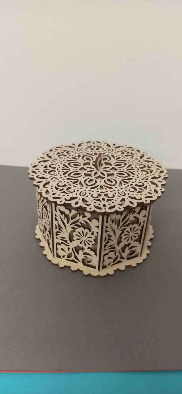 Eine filigrane Holzkiste ist ein wunderbares Geschenk und eine wunderbare Dekoration für Ihr Zuhause. Durchmesser 13 cm.