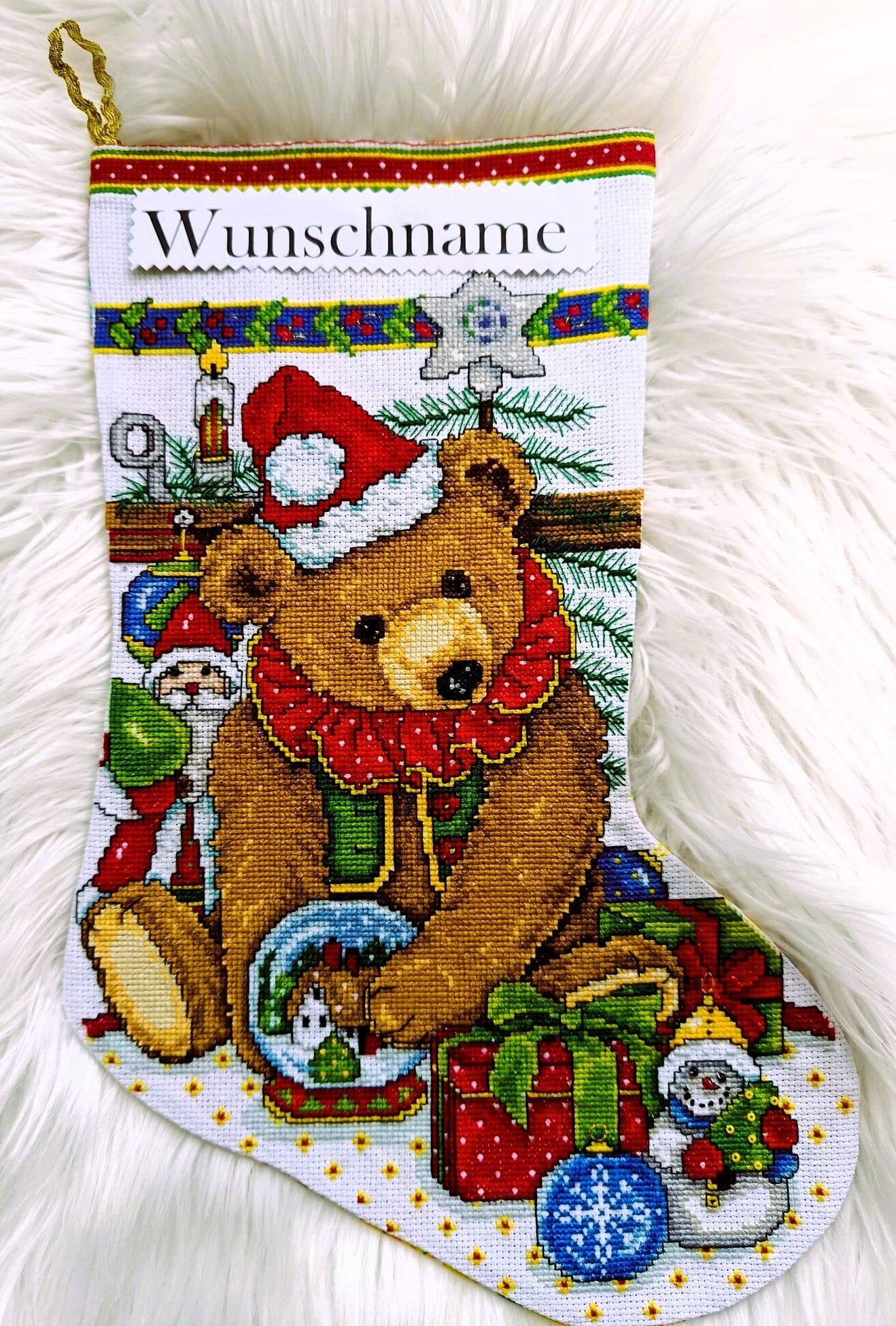 Weihnachtsstiefel mit Teddybär. Handgestickt im Kreuzstich. Auf Wunsch kann der Name des Kindes separat eingestickt werden (Personalisierung im Preis inbegriffen). Der Stiefel ist 38 cm hoch.