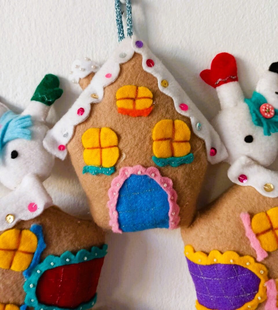 Weihnachtstürdekoration mit Häusern und Schneemännern aus Stoff. Durchmesser 38 cm.