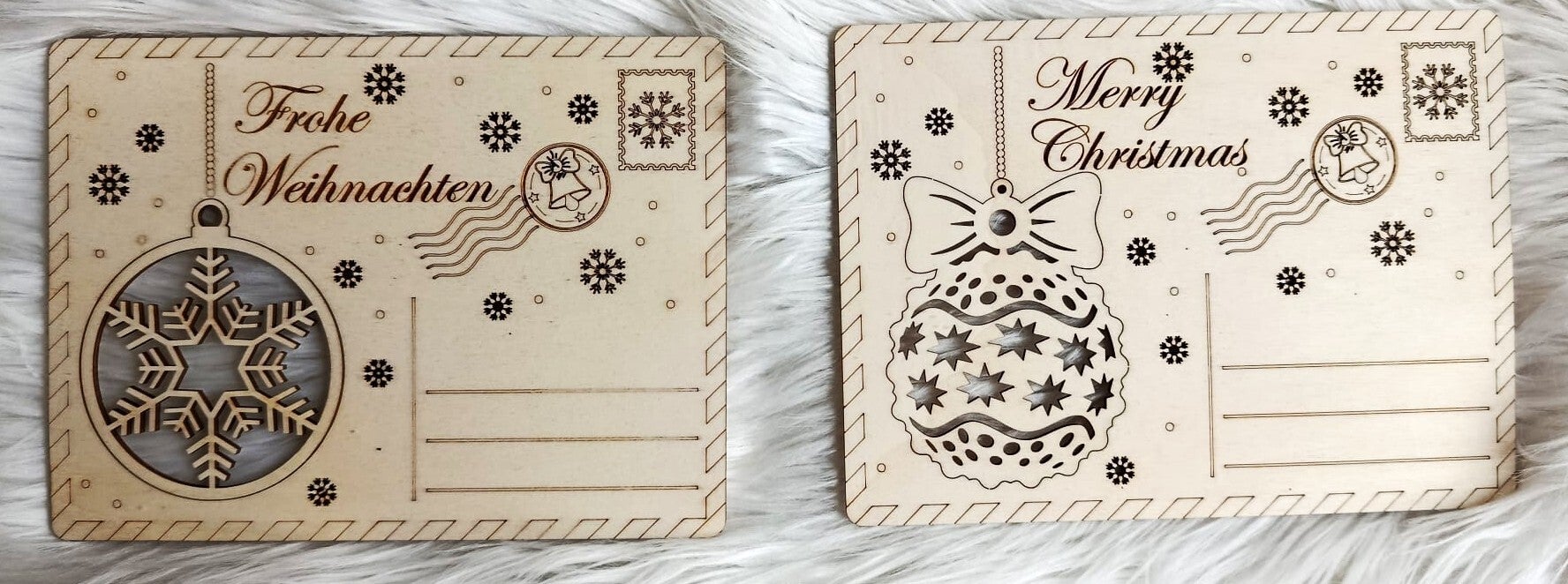 Personalisierte Weihnachtskarten mit Gravur und Christbaumschmuck. Gravur und Personalisierung inklusive. Kartengröße: 18 cm. Größe des geprägten Schmuckstücks: 8 cm.