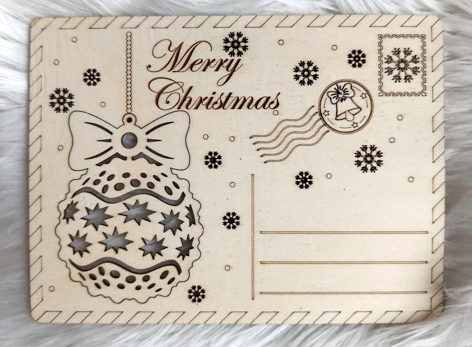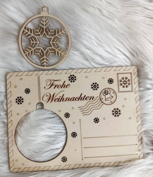 Personalisierte Weihnachtskarten mit Gravur und Christbaumschmuck. Gravur und Personalisierung inklusive. Kartengröße: 18 cm. Größe des geprägten Schmuckstücks: 8 cm.