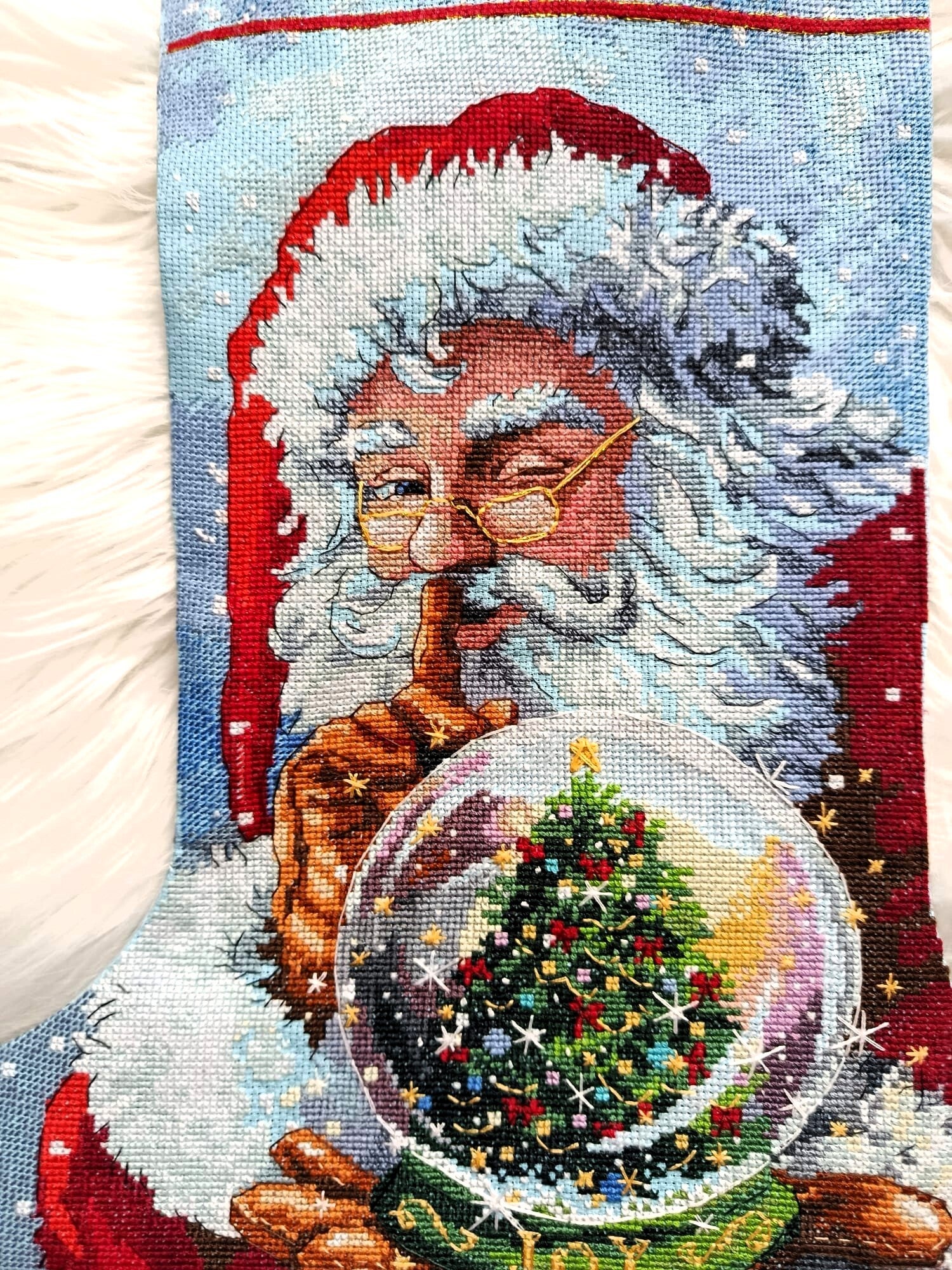 Ein handgestickter Weihnachtsstiefel mit Weihnachtsmannmotiv. Ideal zum Verpacken von Geschenken oder als eigenständiges Geschenk. Personalisierung möglich. Der Stiefel ist 45 cm hoch.