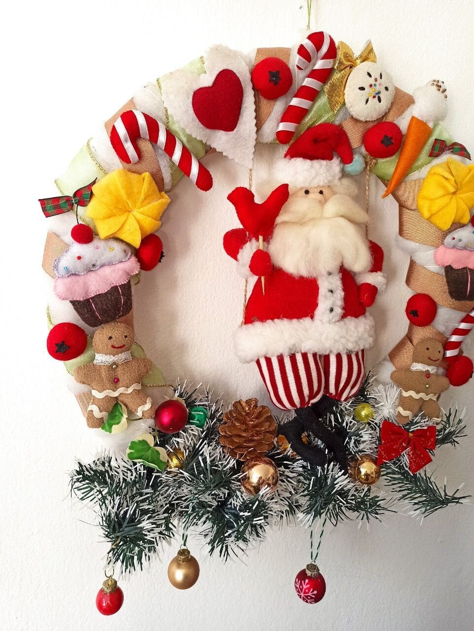 Dieser zauberhafte Weihnachtskranz wurde mit viel Liebe zum Detail handgefertigt und bringt pure Feststimmung in Ihr Zuhause! Im Mittelpunkt steht ein fröhlicher Weihnachtsmann aus weichem Filz, umgeben von liebevoll gestalteten Lebkuchenmännchen, Zuckerstangen, Cupcakes, Keksen und Schleifen – alles aus hochwertigen Stoffen und Filz gefertigt.
